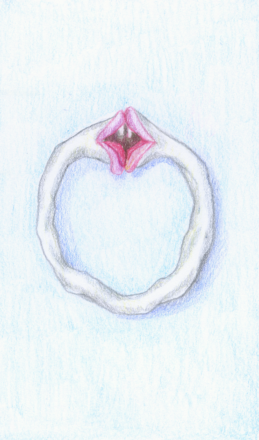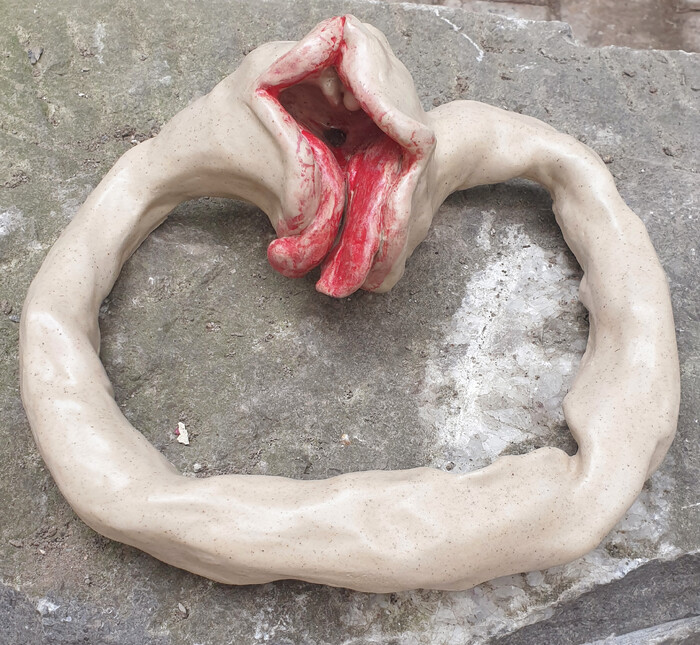 Dependency is a 40 x 40 x 10 cm burned stoneware, and it is a representation of an imagined Ouroborus, situated behind the navel. In a continuous rhythm, the inhaling action of one mouth is the exhaling of another, creating a dependency on one another.