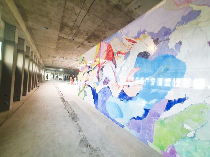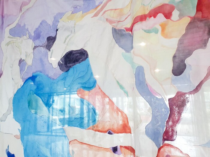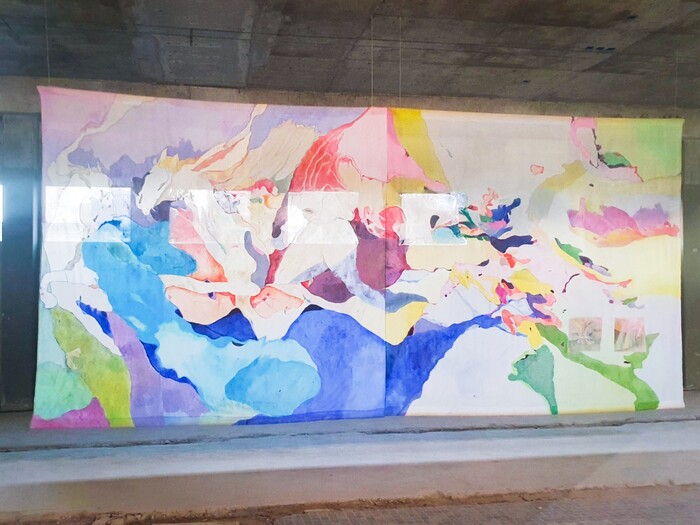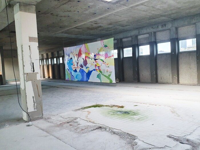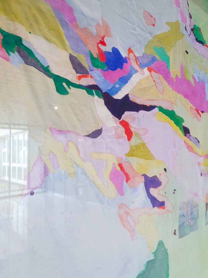 Historically large paintings have been for portraying people in power. This 6x2 meter work was shown during BIG ART in Amsterdam. In this art fair many works inevitably become sturdy and solid because of their largeness, this acrylic on viscose was a reminder of the unstable and shaky nature.